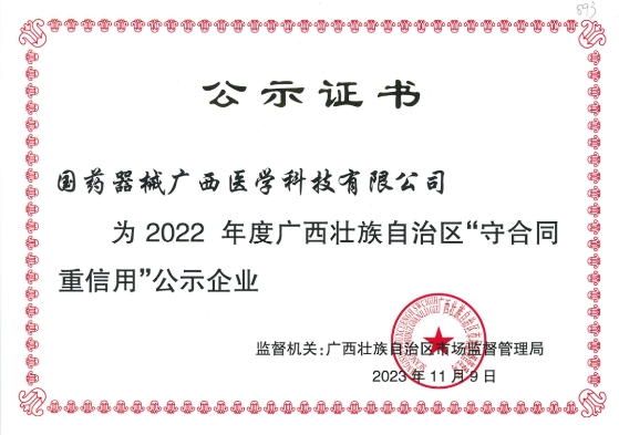 日前,廣西壯族自治區市場監督管理局對符合2022年度“守合同重信用”評審條件的企業予以公示,經各相關部門嚴格審核,榮港城產業園入駐企業——國藥集團廣西醫療器械有限公司(以下簡稱“廣西公司”)及所屬子公司:國藥器械廣西醫學科技有限公司、國藥器械百色有限公司獲評2022年度廣西壯族自治區“守合同 重信用”公示企業。