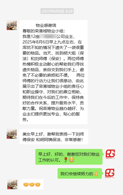 8月6日上午九點,客戶在渾然不知的情況下遺失了一袋很重要的物品。當天,客戶找到物業部保潔胡大姐及保安劉師傅,兩位工作人員熱情積極,并主動耐心的幫助客戶尋找遺失物品。找到遺失物品后第一時間上門親自交到客戶手上,為客戶避免了不必要的麻煩和不便。